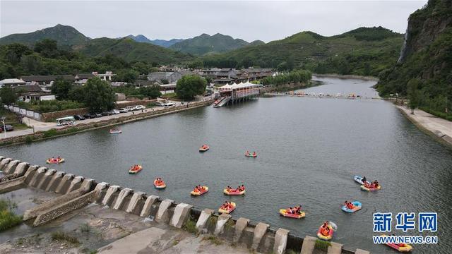 游客在河北省秦皇岛市海港区房庄村的旅游景区内体验漂流(8月20日摄,无人机照片)。新华社记者 杨世尧 摄