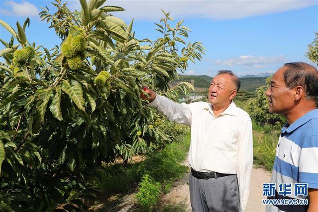 河北省秦皇岛市海港区龙泉庄村党支部书记温守文(左)在和村民交流板栗剪枝技巧(8月28日摄)。新华社记者 杨世尧 摄