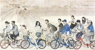 现代新技术与传统交通运输业的融合,催生出以网约车、共享单车、网络货运等为代表的交通运输新业态,不仅为百姓生活带来便捷,更成为美术工作者关注的热点。比如,马鑫中国画《共享单车》,近景处,一群青年男女正骑着共享单车迎风向前;中景处,一排排共享单车整齐地停放着;远景处,一座时尚别致的现代建筑静静矗立,体现了大都市吐故纳新的时代节奏。整幅作品采用全景式构图,展现了现代都市生活的新律动。