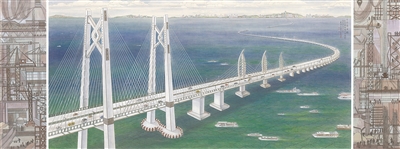 有的美术工作者以跨时空的表达,凸显大型基础设施建设的重大意义。李翔、杨文森、张蕊、张庆军合作的中国画《大湾腾巨龙》,以世界上最长的桥隧组合跨海通道——港珠澳大桥为对象,直观表现了港珠澳大桥对粤港澳三地的衔接功能。画面中心,港珠澳大桥宛若游龙,蜿蜒伸向远方,优美而富有抒情意味;画面远方,群山起伏、楼群高低错落,在大桥连接下与近景形成呼应,构成完整叙事。画面左右两侧,细致勾勒了港珠澳大桥的建设场景,颇具历史纵深感,丰富了画面的视角与层次。透过作品,观众不难感受到粤港澳大湾区发展的新气象。