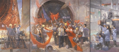 长渠通南北,润泽千万家。作为国家水网主骨架和大动脉,南水北调工程取得重大成就,让1.4亿人的生活更加甜美。刘伟佳油画《穿越江河湖海》便聚焦这一重大战略性基础设施。画面采用三联画的形式,将南水北调的重要工程建设场景与通水现场并置在一起——中间的画面,表现了工人们庆祝穿黄隧洞贯通的热烈场面;左边的画面,展现了工人们施工作业的场景;右边的画面,描绘了北京自来水厂的工作人员检测水质的情形。三联画以跨时空的表达,烘托出这一工程“功在当代,利在千秋”的意义。