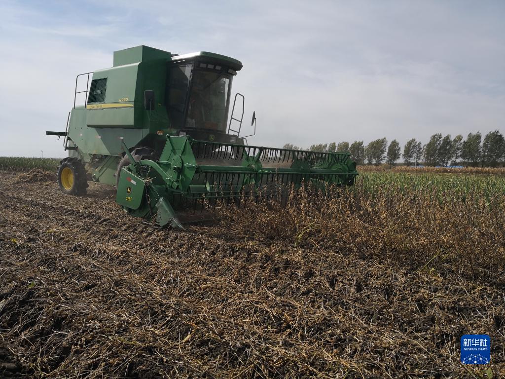 收割机在海伦市海北镇大豆种植园区作业(资料照片)。新华社发
