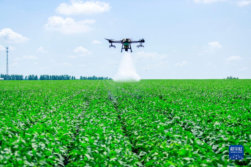 无人机在海伦市东风镇临河村大豆种植园区作业(资料照片)。新华社发